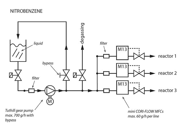 新的硝基苯系統(tǒng)包含Tuthill齒輪泵、排氣閥、三臺(tái)帶過(guò)濾器的科里奧利質(zhì)量流量控制器(M13 mini CORI-FLOW系列)和一些附加設(shè)備。齒輪泵和質(zhì)量流量控制器之間的排氣閥對(duì)于解決硝基苯液體中的氣泡問(wèn)題很有必要。