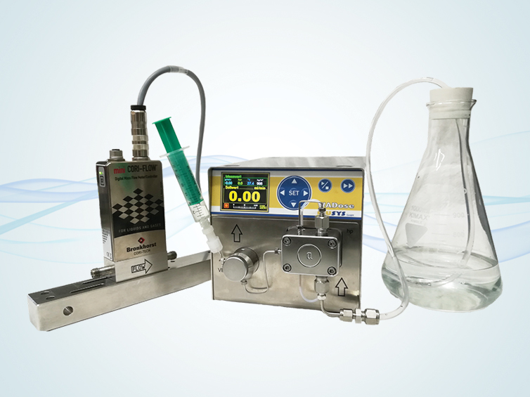 此方案包含科氏質(zhì)量流量計(jì)(其控制著反應(yīng)堆入口側(cè)的HPLC活塞泵)和出口端獨(dú)立運(yùn)行的背壓控制器。大量數(shù)據(jù)和實(shí)踐驗(yàn)證,科里奧利質(zhì)量流量計(jì)(mini CORI-FLOW ML120)穩(wěn)定而又準(zhǔn)確。WADose HPLC泵提供穩(wěn)定的流量,無脈動(dòng)。HPLC泵和質(zhì)量流量計(jì)可組合成為質(zhì)量流量控制器。由于泵是作為執(zhí)行器,所以控制閥并非必需。