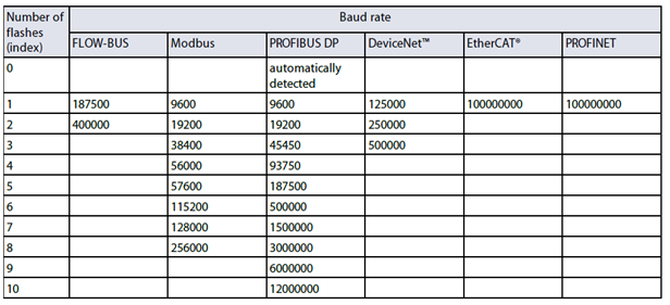 綠燈顯示的是十位 ,紅燈顯示的是個(gè)位。如綠燈閃爍3次,紅燈閃爍5次,則該儀表的地址為:35。兩燈同時(shí)閃爍的次數(shù)為對應(yīng)各種總線的波特率。(請查看下表)